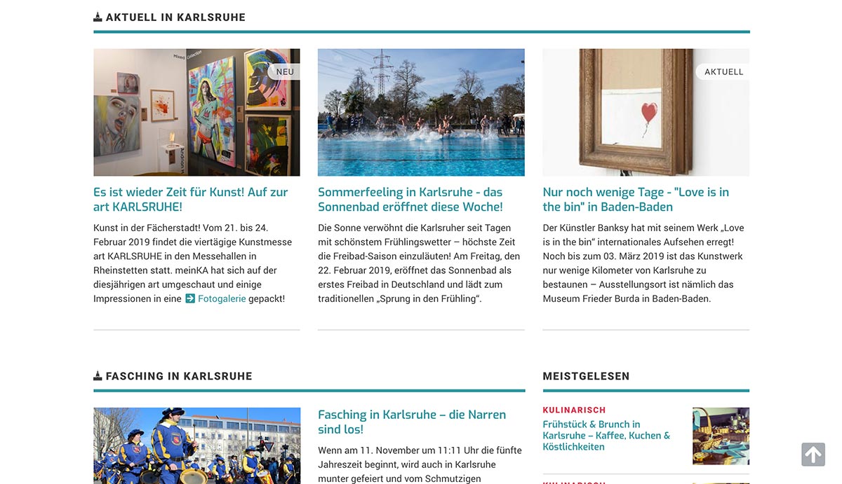 MeinKA is a new information platform and news site for the city of Karlsruhe that we launched in the beginning of 2019 in cooperation with Creative Studio Daniel Wiegand and Stadtwerke Karlsruhe. The project has a very strong focus on content, good SEO and site performance. Custom modules had to be developed to make the content creation flexible and easy at the same time.