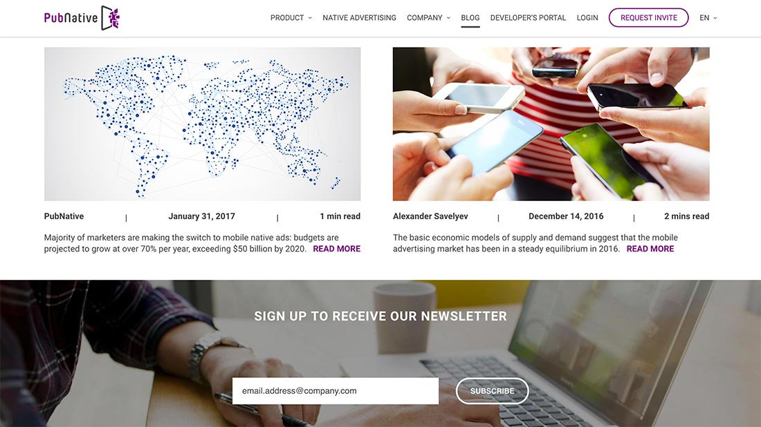 PubNative is a startup from Berlin that has a great mobile native advertising platform. They had their in-house marketing theme design a modern look for the relaunch of their site. For the implementation we made a completely custom WordPress theme with many custom effects.
